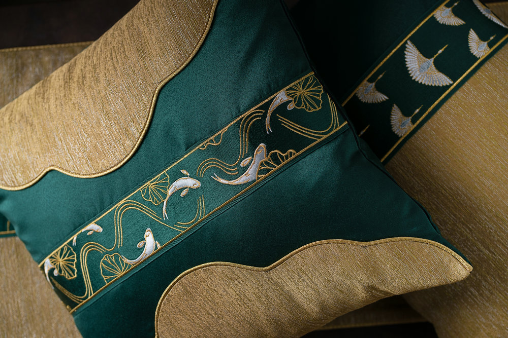 荷花、錦鯉、祥云、流水,鎏金閣系列將傳統(tǒng)元素與摩登時(shí)尚的新設(shè)計(jì)相融合,以席紋底帶呈現(xiàn)華貴光感,展示新中式的時(shí)尚與富麗堂皇。